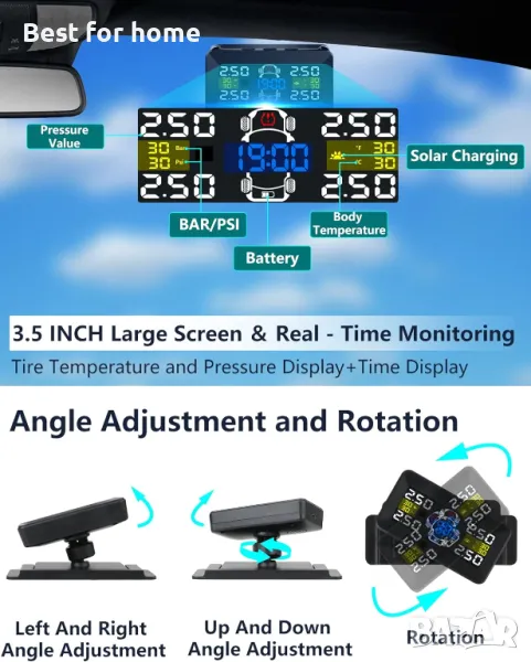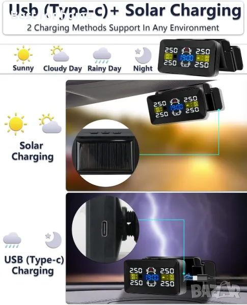 Слънчева и USB: Системата за контрол на налягането в гумите TPMS се зарежда с високоефективен слънчев панел и Type-C, не заема гнездото на запалката на автомобила и гарантира, че TPMS продължава да работи. Дизайнът на подвижната стойка, дори ако TPMS е инсталиран на предното стъкло, мониторът може лесно да се свали за зареждане. TPMS превключва в режим на заспиване 5 минути след спиране на автомобила и се активира автоматично след стартиране на автомобила.