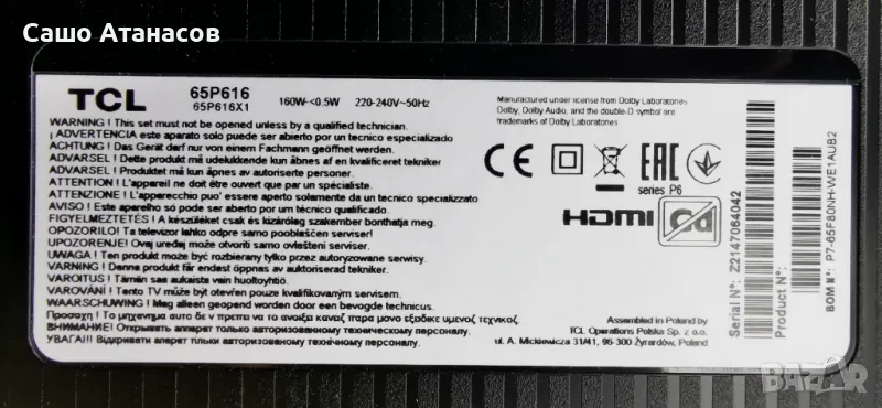 TCL 65P616 със счупена матрица ,40-L171H4-PWC1CG ,40-RT51G2-MAD2HG ,WT22M2600 ,LVU650NDEL CS9W15 V1 → Обява 48373635