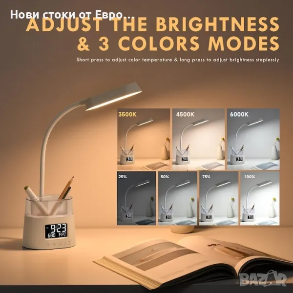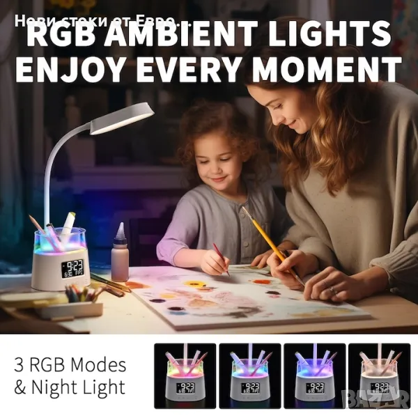 LED настолна лампа, WALALLA, USB, бялаПерсонализирано осветление: Насладете се на осветление, което се адаптира към вашите нужди с контрол на интензитета и 3 специфични цветови температури (3500K топло, 4500K неутрално, 6000K студено). Тази симпатична настолна лампа е идеална за различни настройки, от фокусирана учебна лампа за ученици до мека светлина за четене на приказки за лека нощ. Неговият регулируем и гъвкав дизайн пасва идеално на декора на общежитието и домашните офиси, което го прави прекрасен подарък за студенти. В допълнение, неговата технология за грижа за очите намалява напрежениетоЛесна за използване надстройка: Насладете се на удобството на подобрения LCD екран на нашата настолна лампа, който не само показва часа, но също така ви позволява да регулирате яркостта по ваш вкус. Независимо дали имате нужда от мека светлина за спокоен сън или ясна видимост за време, тази лампа отговаря на всички ваши нужди, като същевременно поддържа спокойна среда.Интегриран USB порт и държач за писалка: Открийте най-добрата комбинация от полезност и организация с нашата иновативна основа за лампа. Снабден е с USB порт за зареждане, за да поддържа напълно заредени основни устройства като смартфони и таблети. Интегрираният държач за писалка също така гарантира, че инструментите за писане и малките офис консумативи са добреорганизирани, което го прави идеално допълнение към всяко ефективно работно пространство или учебна зона.Изключително гъвкава 360° гъша шийка: Осветете вашето пространство точно както искате, с напълно регулируемата 360° гъша шийка на нашата малка настолна лампа. Без усилие огъвайте и завъртайте лампата във всяка позиция за прецизно и удобно осветление при всяка дейност. Той е идеален за осветяване на сложни проекти в офиса, създаване на уютен кът за четене или добавяне на амбиентно осветление към вашата спалня, всичко това с издръжлива и висококачествена конструкция.RGB осветление и ефективно управление на времето: Добавете фина нотка на атмосфера към вашето работно пространство или зона за учене с опцията закомпактно RGB осветление на лампата, осигуряваща мека светлина за подобряване на концентрацията или релаксацията. Таймерът за 15, 30 и 45 минути ще ви помогне да управлявате времето си ефективно, като стимулира концентрацията и предотвратява изтощението по елегантен и практичен начин.