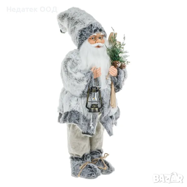 Коледна декоративна реалистична фигура на Дядо Коледа със сиво бял костюм, фенер, камбана на шапка и дървени ски обувки с елхова клонка и борови шишарки. Украсява всеки ъгъл на къщата и приветства празниците! Вълшебният свят на Коледа оживява!