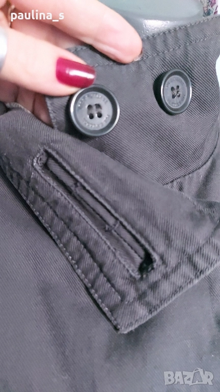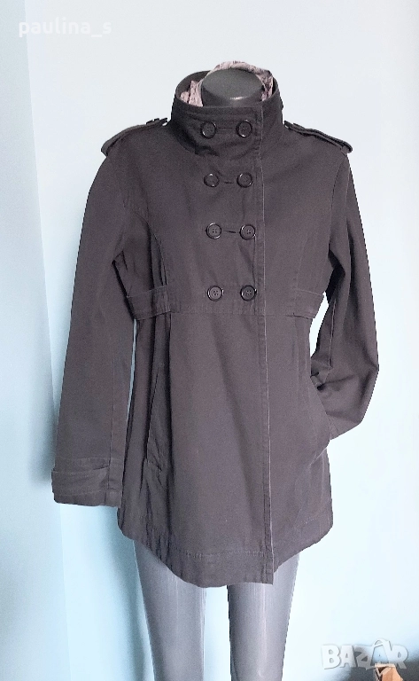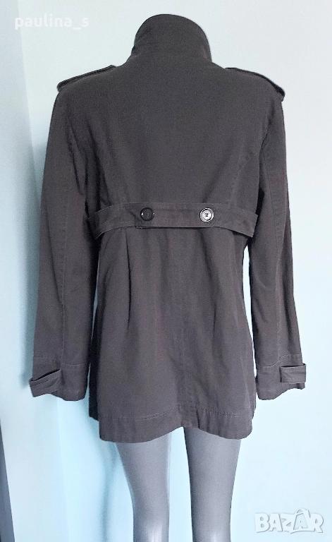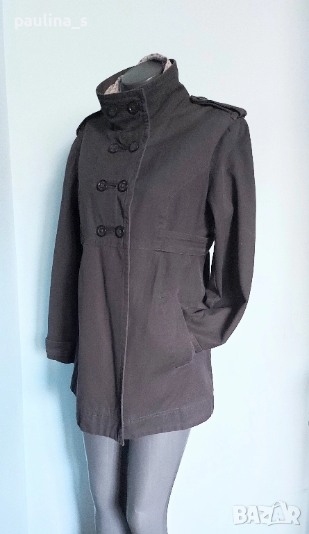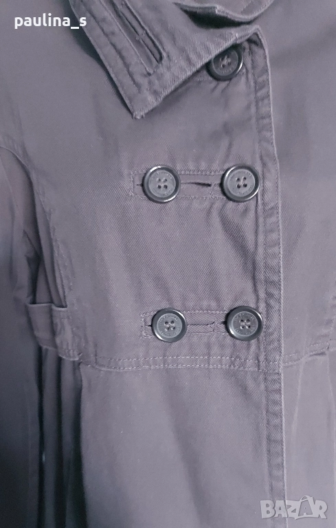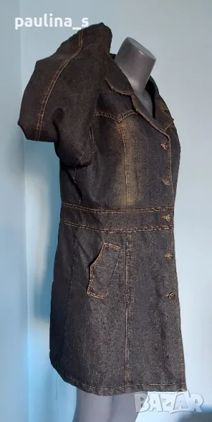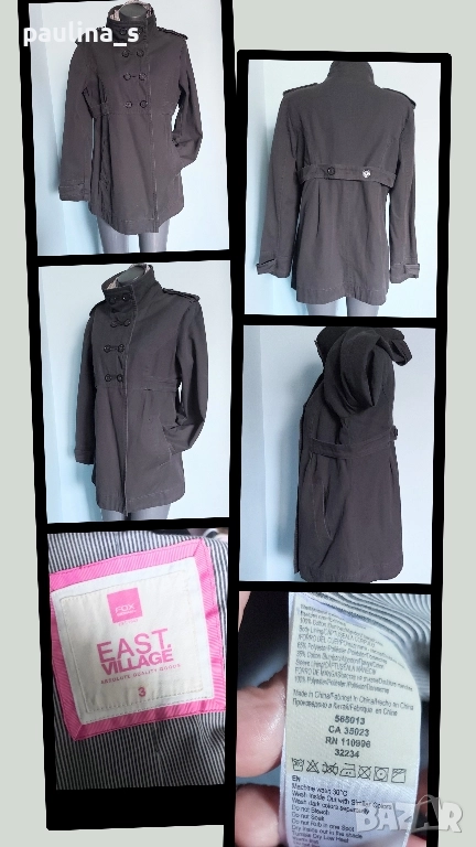 2️⃣. Колаж / L / XL - "East Village". Цената е крайна, без пазарлъци 49,99лв / 25 евро. Дамски дънков шлифер / манто / парка. Моделът е с висока яка, двуредно закопчаване и 3 степени на ширината на идваща от илиците, пагони. Разкрояването започва от нивото под бюста, като е маркирано с двойно тигелиран колан-лента с копчета. Джобовете са разположени косо отпред и са допринасящи за спортното звучене на дрехата, като нова, без дефекти, брандирани копчета и безупречен хастар. Уникална.