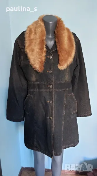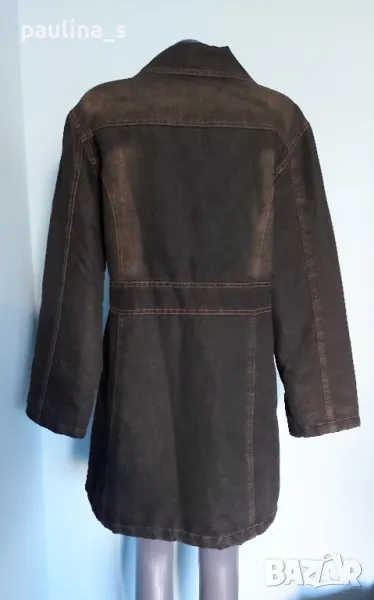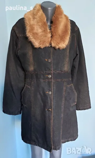 1️⃣. XL / 2XL - "Donna 10" - Цената е крайна 49,99лв / 25 евро. Топло дънково палто / манто, с избелващ ефект в кафяво. Контрастните украсителни тегели са в кафяво, силуетът е втален. Материята е плътна, има дебела вата за подплата в капитониран хастар. Без дефекти, една бройка е. Яката е от еко