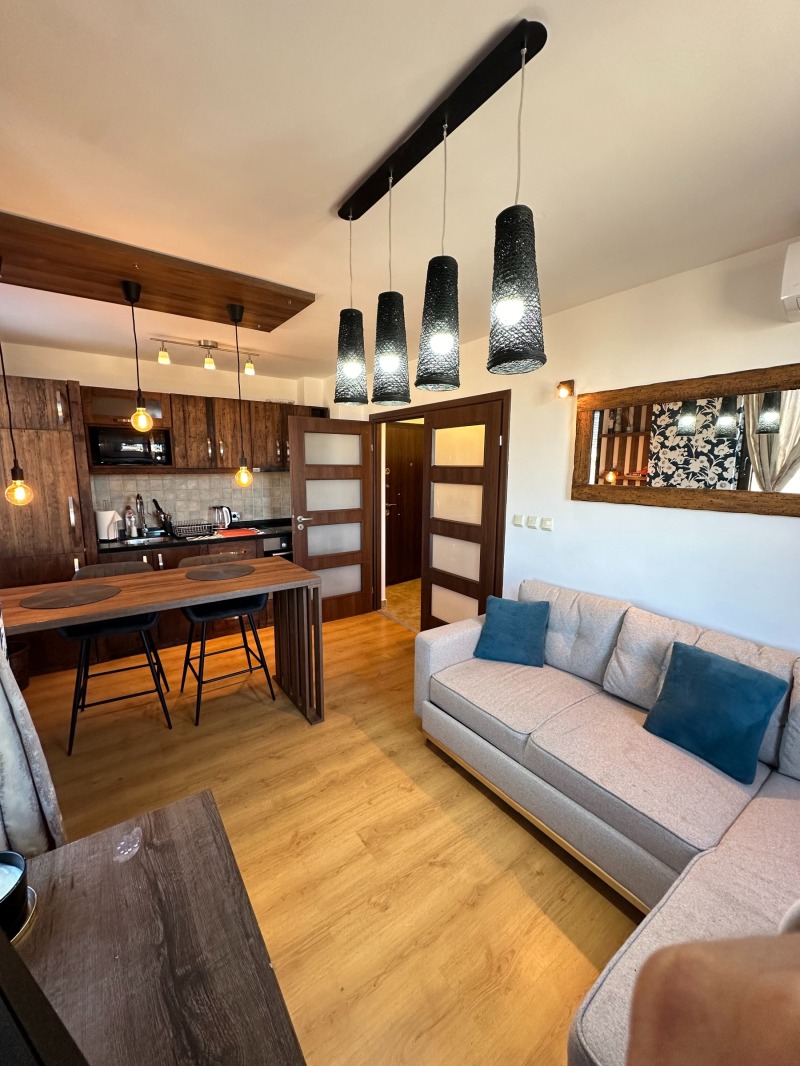 Разпределение: входно антре, дневна стая с кухненски бокс, две самостоятелни спални, баня с тоалетна и балкон с панорамна гледка към Пирин и Рила планина.