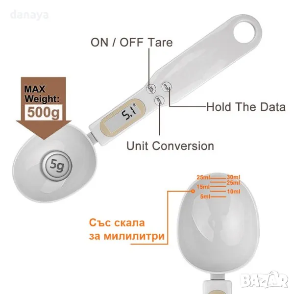 Това е един перфектен помощник на всяка една домакиня, помагащ за претеглянето на сметана, брашно, подправки и т.н. Лъжичката е снабдена с различни мерни единици, две функция HOLD – за калибриране и задържане. Измерването на течности е от 5мл до 30мл, а пък за тегло е до 500 грама. Чрез бутона ON/OFF можете да включвате или да изключвате лъжичката. Също така има LCD дисплей, който освен че е широк е и лесен за четене.
