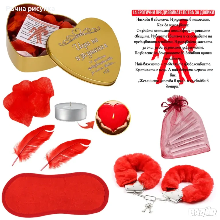 Пета снимка-Kомплект "Игра на изкушенията" в метална кутия сърце.