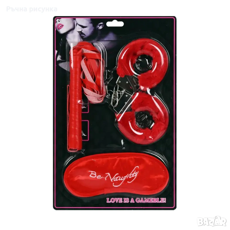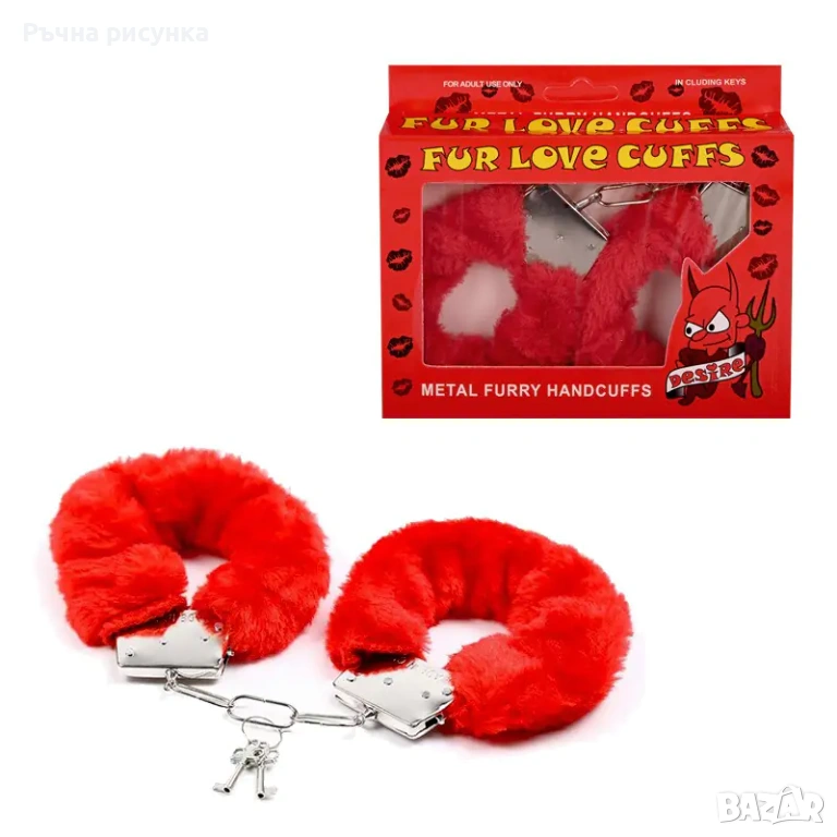 Осма снимка-Комплект белезници с еротични зарчета, превръзка и пера.