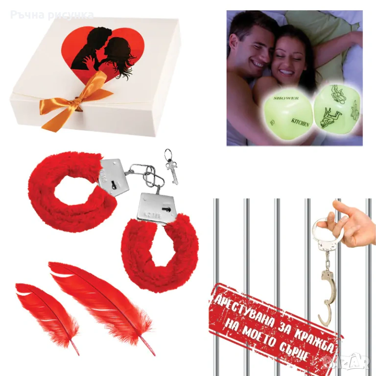 Единадесета снимка-Kомплект "Арестуван за кражба на моето сърце!" с белезници, зарчета и перца в подаръчна кутия.