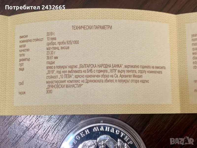 N5. България 2019 = Сребърна възпоменателна монета “ Дряновски манастир “