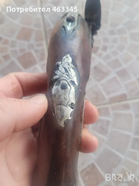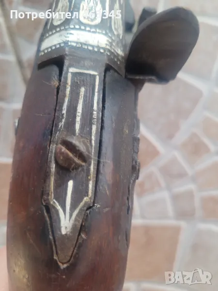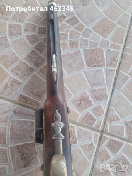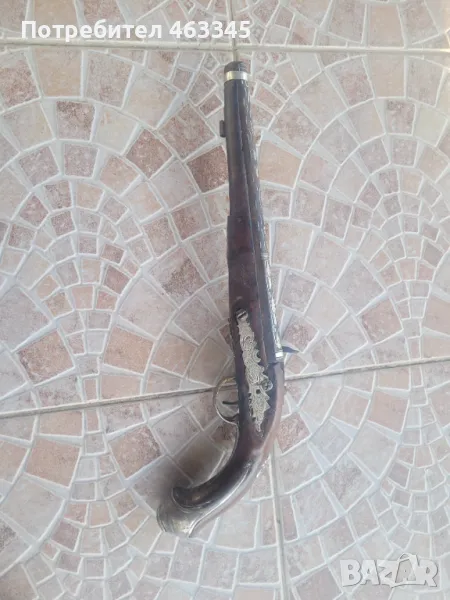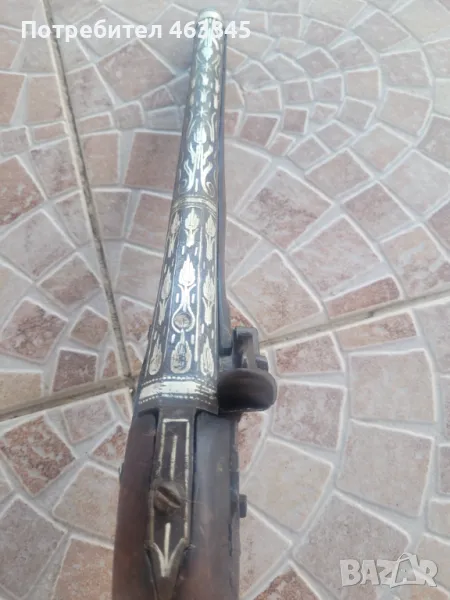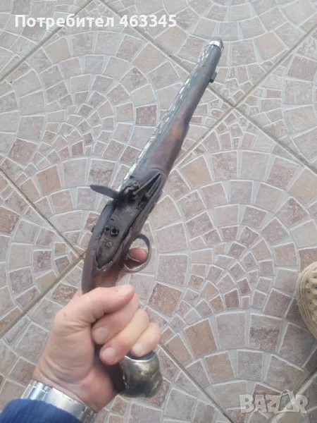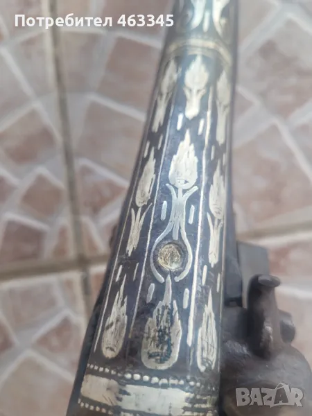 Страхотен османски кремъклия. Лекичко му почистих цевта за да изпъкната многобройните орнаменти на сребърната набивка, които бяха почернели, поради високата проба на среброто. ВНИМАНИЕ!!! Налична тугра отгоре, в основата на цевта. Налично сребърно монограмче и плочка от другата страна. На механизма липсва петлето, но самия механизъм работи нормално (като се завърти с клещите) и спуска. Сребърна топка. Дървенията на пищова е в отлично състояние без дървояд и без отчупено. Слагате му едно петле и имате изключително колекционерско бижу, което става и за възстановки. Когато аз му намеря петле пистолетът вече ще струва 2000 лв
