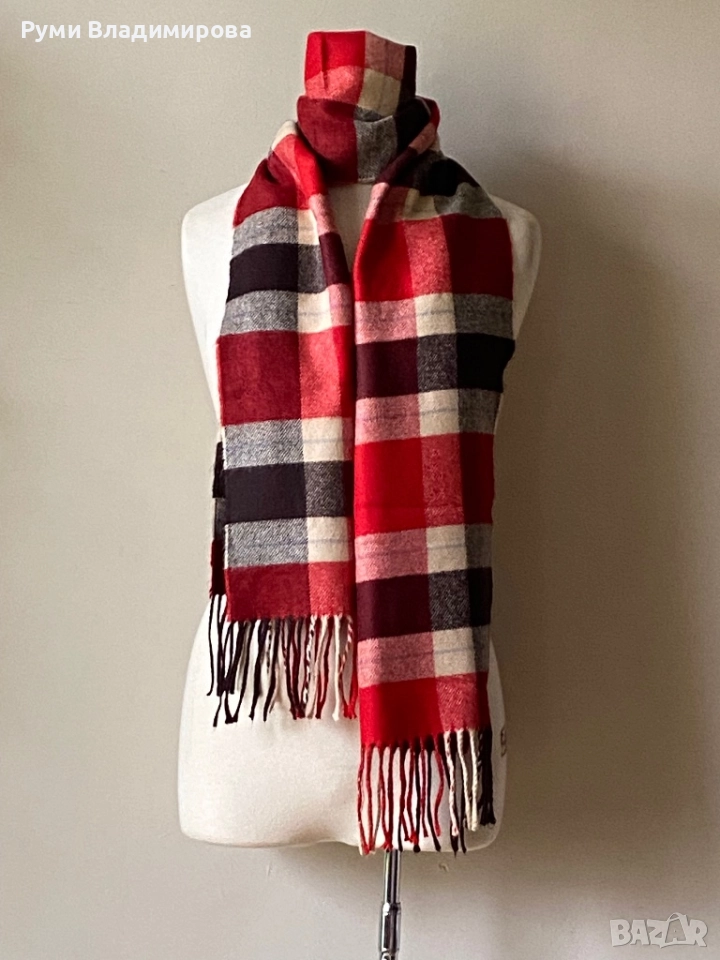 Лилав, кариран, мъжки шал, Basile, 100 % вълна, мека, мъхеста, топла материя, винтидж шал, в карето бяло и червено, размер 166 Х 30 см, нов, доставка с Еконт.