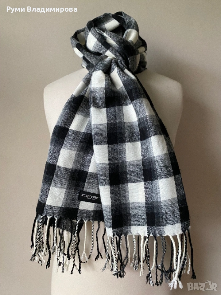 Мъжки шал Iceman в бяло и черно каре, с ресни, размер 39 Х 170 см, липсва етикет за състав, мека материя, бутикова датска марка за мъжка мода.