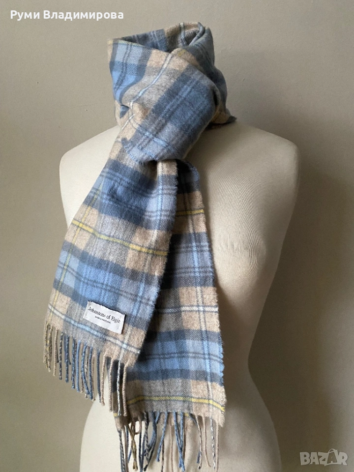 Kариран, мъжки шал Johnstons of Elgin, луксозен, английски бранд за шалове, в бледи нюанси на бежово, светло синьо и жълто , липсва етикет за състав, но марката прави изключително шалове от кашмир, фина вълна и т.н., виж сайта й, кашмирена материя, в отличен вид, доставка с Еконт.