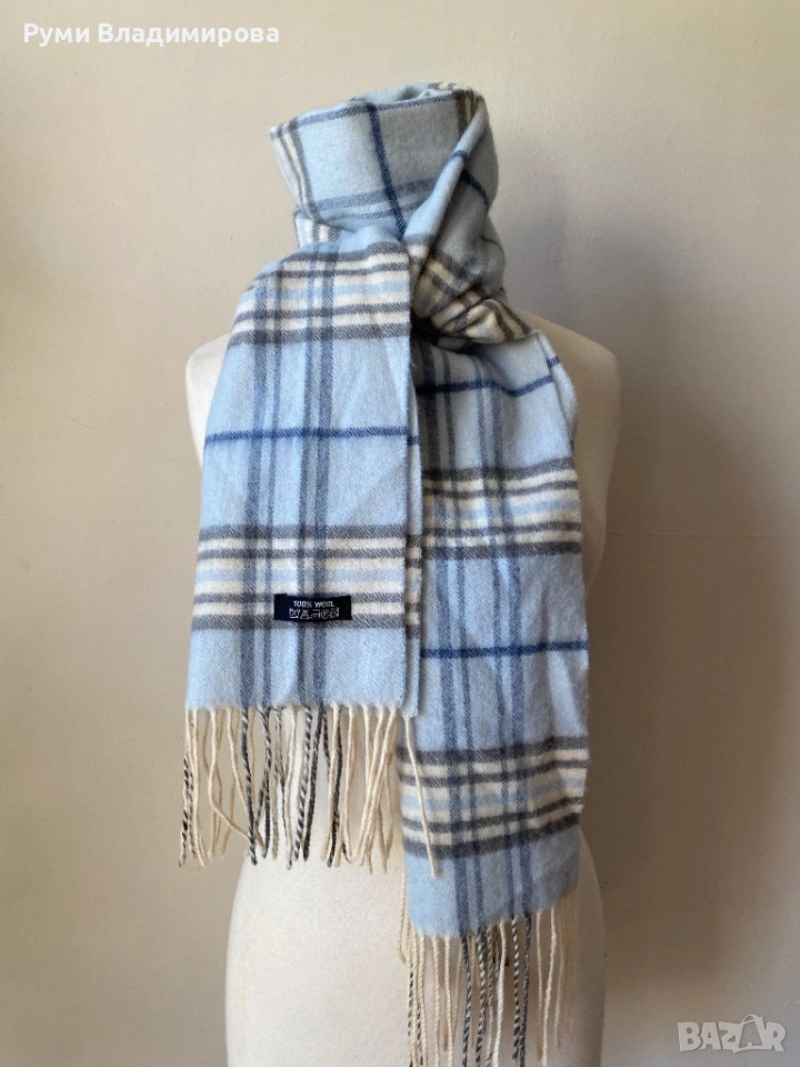 Светлосин, кариран, мъжки шал от 100 % вълна, бяло, сиво и тъмносиньо в карето, отлично състояние, доставка с Еконт.