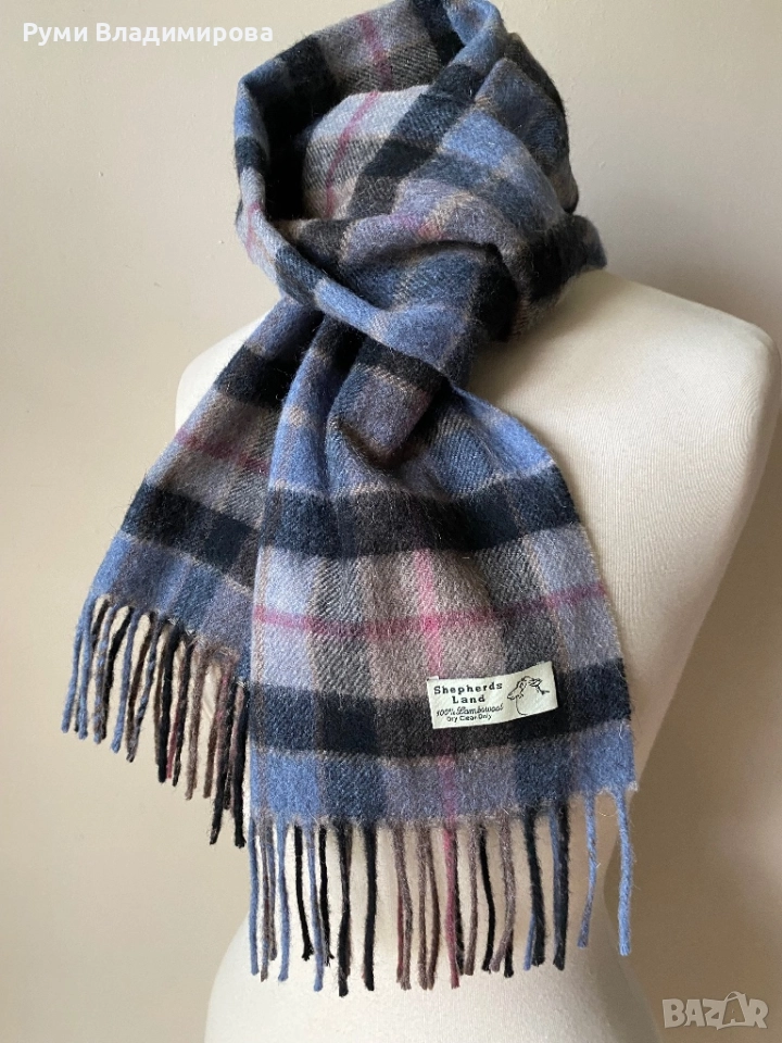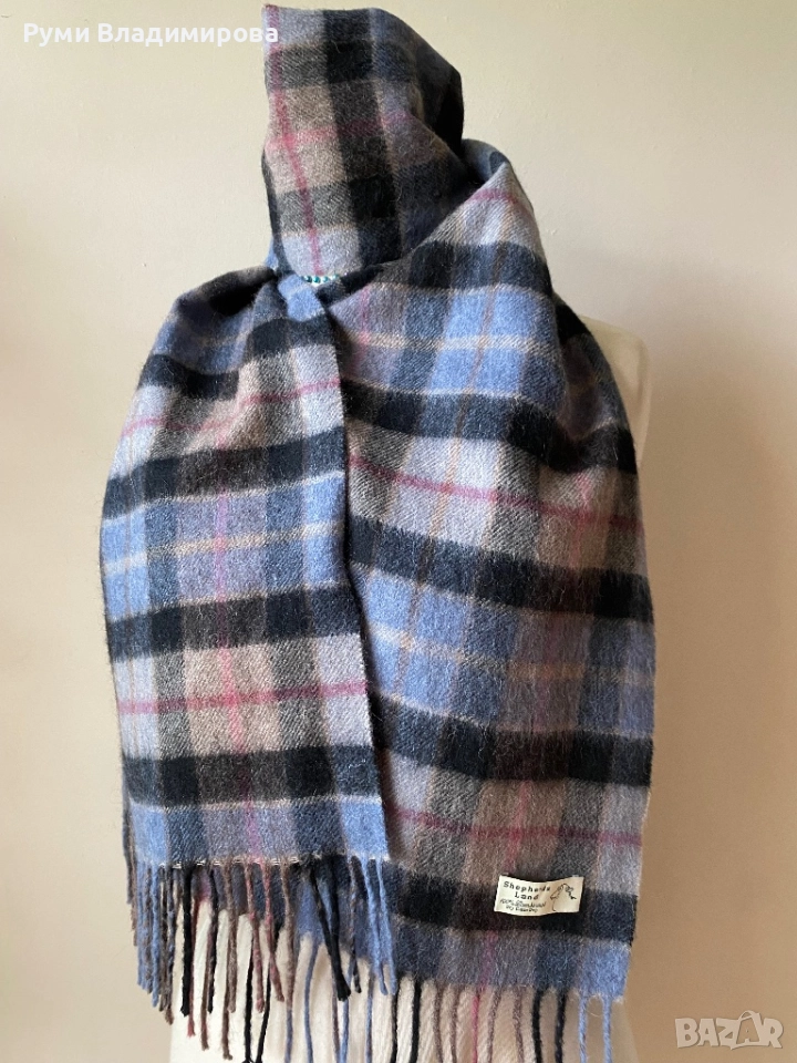 Мъжки шал Shepherds Land от 100 % агнешка вълна с ресни, размер 148 Х 30 см, дребно каре в светлосиньо, черно и малко розово, доставка с Еконт.