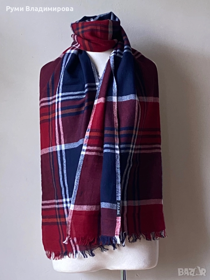 Мъжки кариран шал Zara Мен, eдро каре в тъмно синьо и тъмно червено, голям размер, състояние нов, състав 100 % вълна! Доставка с Еконт.