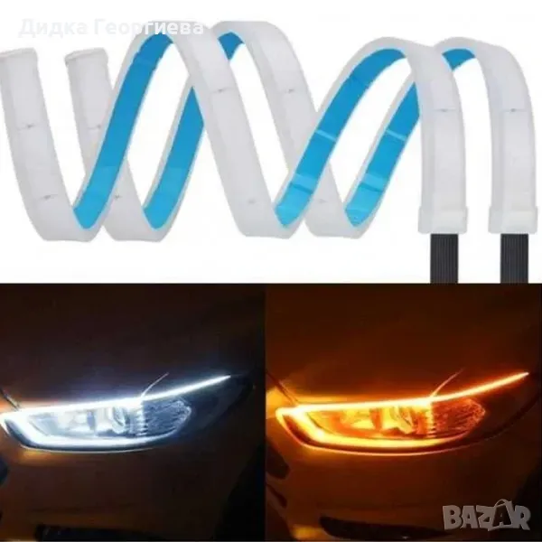 Гъвкави дневни светлини и декорация за фарБърз и лесен монтаж с двойнозалепващо тиксо.За вътрешно/външно използване на автомобил.Диодните ленти имат 3 секции на скъсяване 30cm/40cm/60cm.Работно напрежение: 12 V.Работна температура: от -40 C до +80 C.Защита от влага: IP65 (бодоустойчиви)Интензитет на светлината: 400 Cd.Мощност: 6 W.Цвят на корпуса: бял.Цвят на осветлението: бяло + жълто.Комплект включва 2бр. ленти