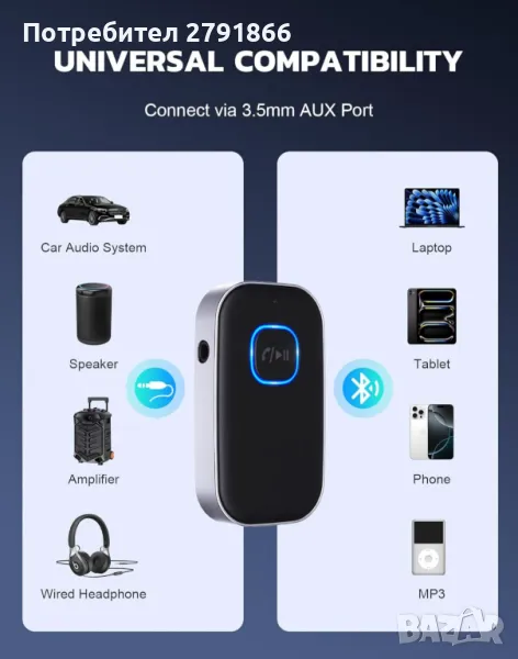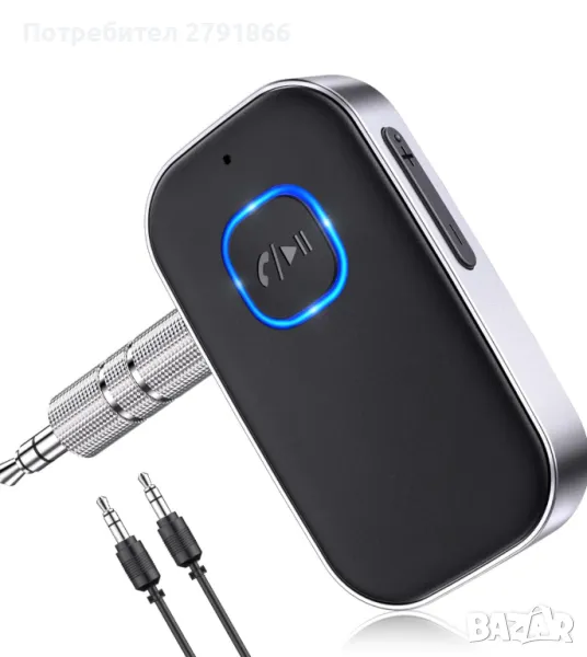 Bluetooth 5.0 приемник за кола или домашно стерео, шумопотискащ Bluetooth AUX за 2 устройства