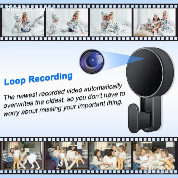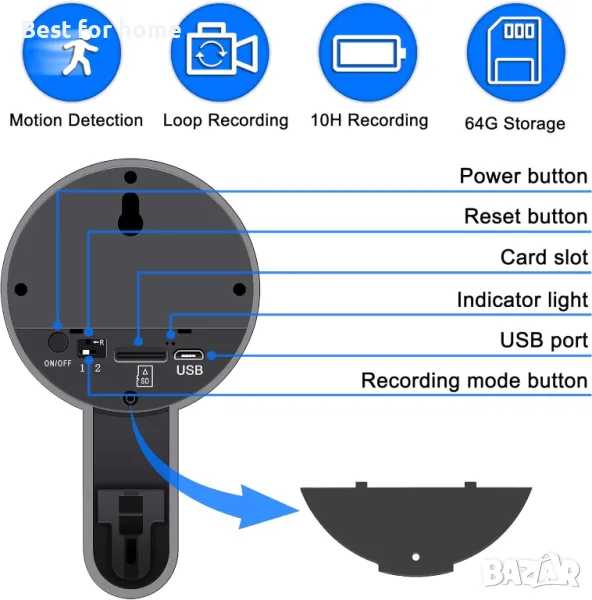 Устройството също поддържа 256GB TF карти, осигуряващи достатъчно място за съхранение на записани видеоклипове. Неговата функция за откриване на движение гарантира, че започва да записва автоматично, когато бъде засечено движение, и се доставя с две пластмасови силни лепила с пирони за лесен монтаж.