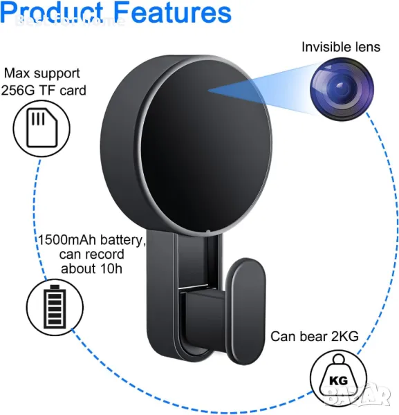 Cengferder Clothes Hook Hidden Spy Camera е компактно и дискретно устройство, което предлага висококачествен 1080P HD видеозапис. Има 1500mAh акумулаторна батерия, която може да записва до 10 часа видео при пълен заряд на батерията или 24/7 часа- когато е свързан към източник на захранване.