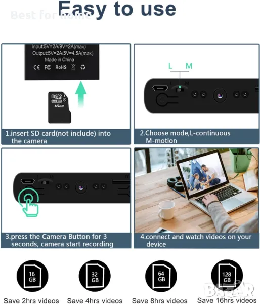 Лесен за използване - Не е необходим wifi. Просто поставете TF-карта (MAX поддържа 128G, не включва), завъртете превключвателя за режим на позиция „L“ за непрекъснат режим, позиция „M“ за режим на откриване на движение (няма да мигат светлини по време на запис).