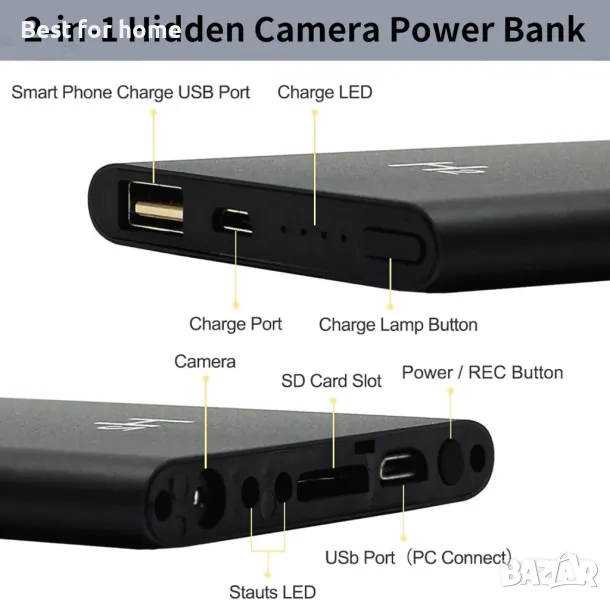 【Маскировка на преносима батерия】: Скритата камера е маскирана като захранваща банка с капацитет 5000 mAh, която може да зарежда вашето устройство и да действа като скрита камера, без никой да забележи.