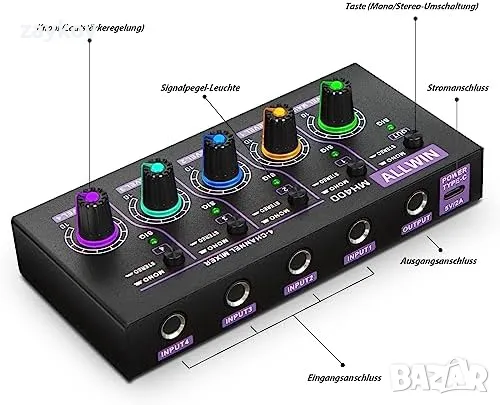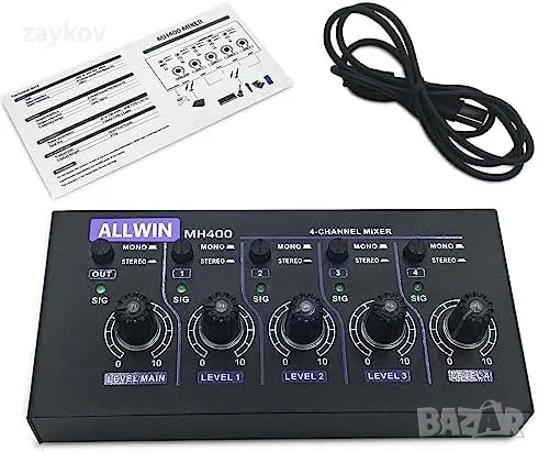 ALLWIN DC5V 4-канален мини аудио миксер 4 в 1 изход Моно и стерео поддръжка за субмиксер
