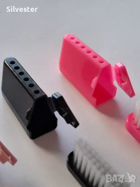 Специална четка за пътуване с предпазно капаче. Много ефективна, компактна и лека. Капачето има вратичка ( на снимката) отваря и се затваря, леко се щраква и заключва четката да не излезе.