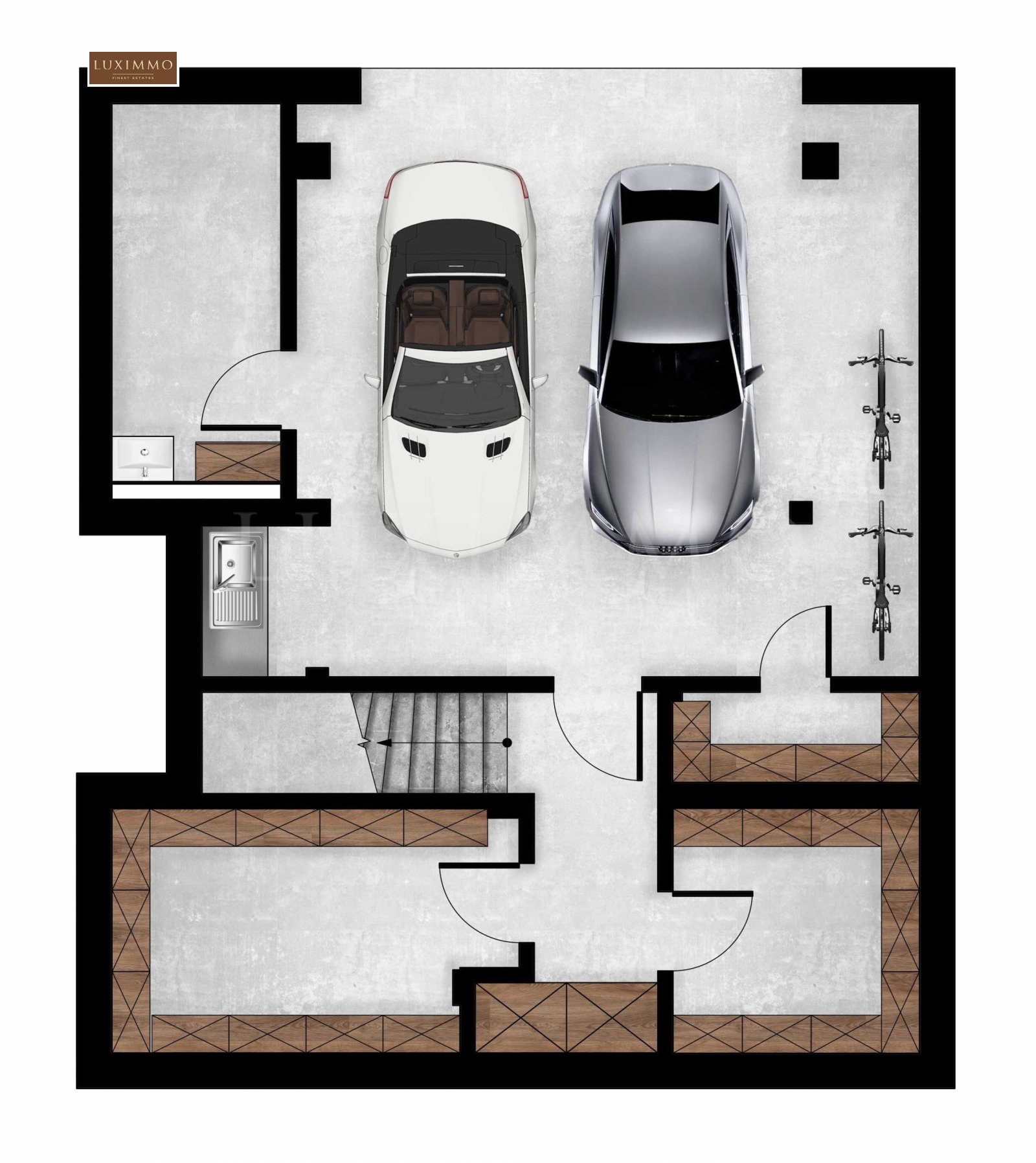 Сутерен - 111.95 м², състоящ се от гараж за два автомобила, техническо помещение и три склада;