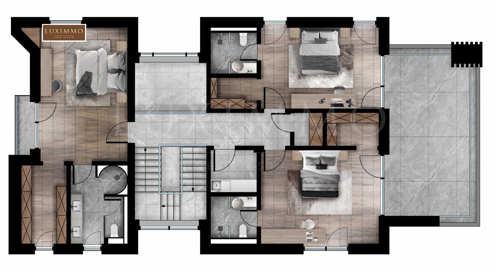 Етаж 2 - 174.50 м², състоящ се от три спални, перално и складово помещение. Основната спалня е в отделно крило, със собствена баня и гардеробна. Във второто крило има още две спални, всяка със собствена баня, гардеробна и споделена тераса.