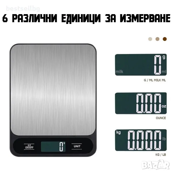 - 6 единици за измерване (g, lb, oz, ml, milk ml, kg)