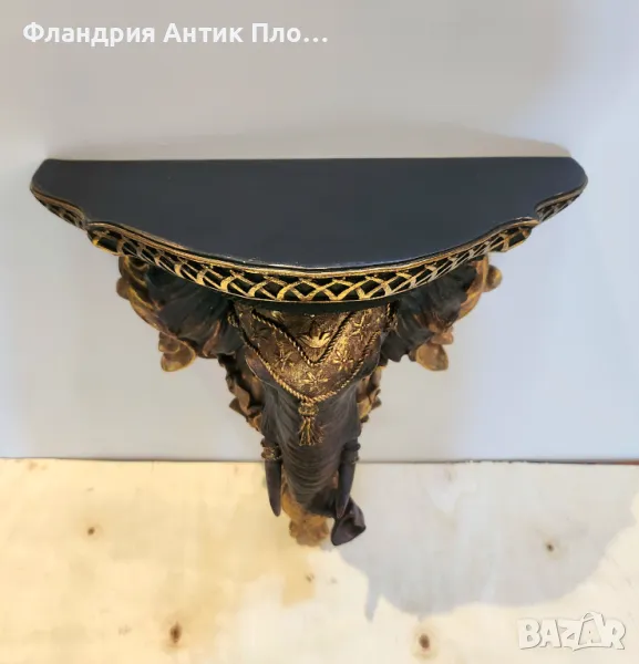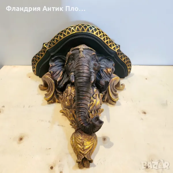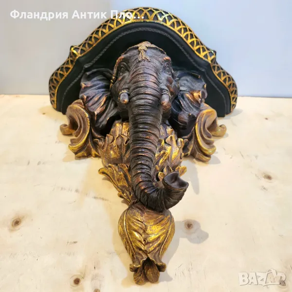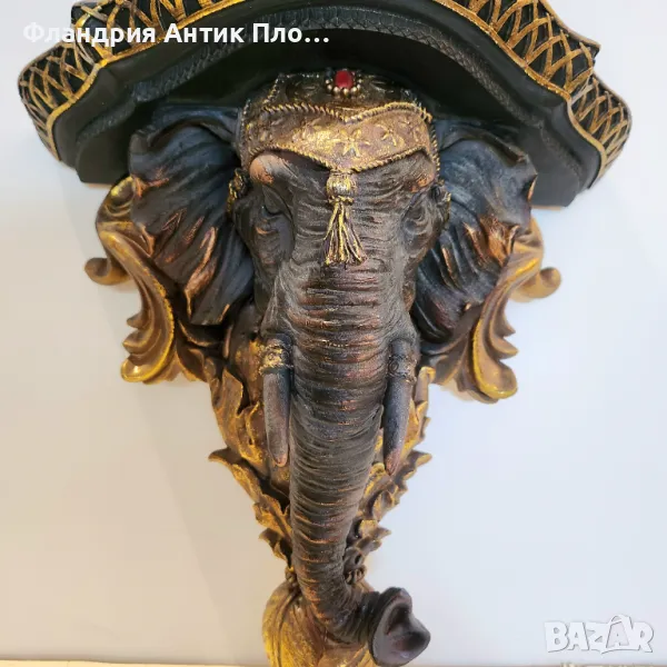 Тази изключителна декоративна конзола с глава на слон е съчетание от изтънчена елегантност и екзотичен стил. Изработена от полирезин и завършена с ръчно нанесени златисти акценти и фини детайли, тя е символ на сила, мъдрост и късмет. Горната част е подходяща за поставяне на малки декорации, свещи или вази.