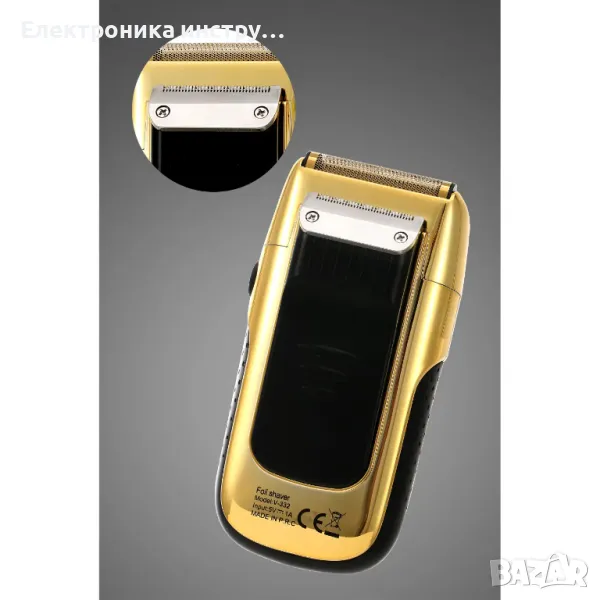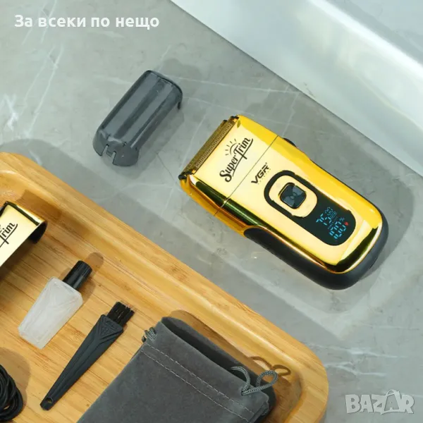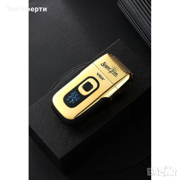 Професионална електрическа самобръсначка, самобръсначка и тример, VGR V-332, двойни ножчета, 3 регулируеми скорости, с цифров дисплей, 45 мм титаниево фолио, Li-ion 150 мин, 7500 об/мин, USB презареждане, златист метал
