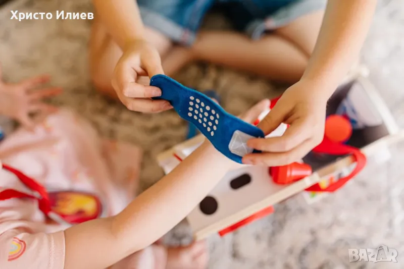 Комплектът включва 14 части и осигурява часове забавни ролеви игри. Децата могат да закачат карта за мисия отстрани на дървеното куфарче, да обърнат блока, за да покажат нивото на спешност, да завъртят циферблата към значката на кученце, което да им помогне, след което са готови за вълнуващи мисии и приключения! Детето трябва да избере инструментите за първа помощ, за да помогне във всяка мисия - сред тях са термометър за игра, епруветка с мехлем, превръзки, отоскоп, ножици, пинсети и спринцовка. Има дори рентгенова снимка, която се закрепва отстрани на дървената кутия!