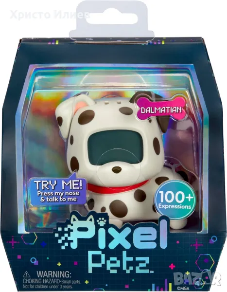 Този сладък дигитален спътник реагира на вашия глас и докосване, отговаря с над 100 реакции и комуникира с други Pixel Petz! Вашият далматин Pixel Petz развива уникална индивидуалност въз основа на начина, по който изберете да играете, създайте си единствен по рода си приятел. Вашето дигитално кученце усеща докосването ви, докато го галите, храните и подстригвате, и отговаря с лаене!