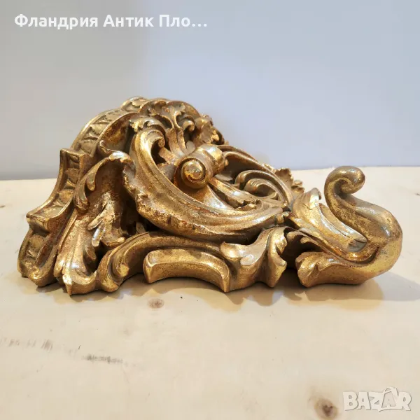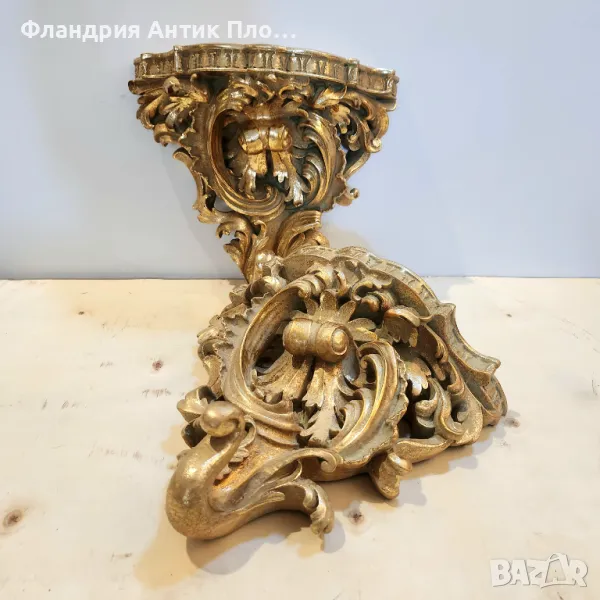 Тази изящна стенна конзола впечатлява със своите богати орнаменти и златисто покритие, което ѝ придава луксозно и аристократично излъчване. Изработена с внимание към детайла, тя носи духа на класическия бароков стил. Перфектна за декорация на стени, подходяща за поставяне на вази, статуетки или други декоративни елементи.