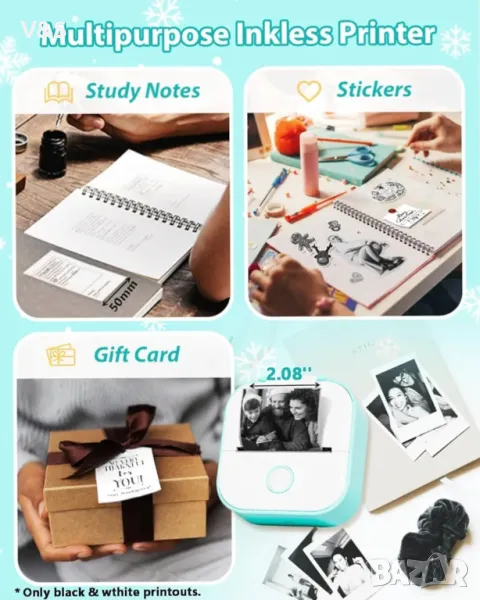 Принтер,Мини мобилен термопринтер,печат на снимки,стикери, бележки, етикети, хартия 53 мм, Bluetooth