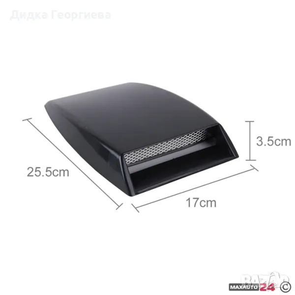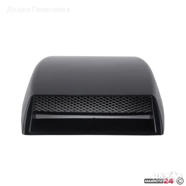 Декорация наподобяваща въздуховод.Придава спортен вид на автомобила.Универсална,пасваща на повечето автомобили.Изработена от ABS пластмаса с алуминиева решетка.Лесно монтиране с двойнозалепващо тиксо.Размер: Д25,5 х Ш18 х В3,5 см.Цвят: Черна