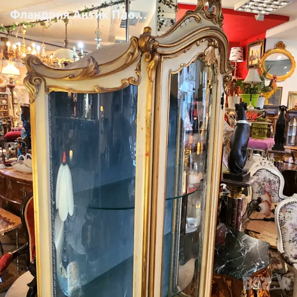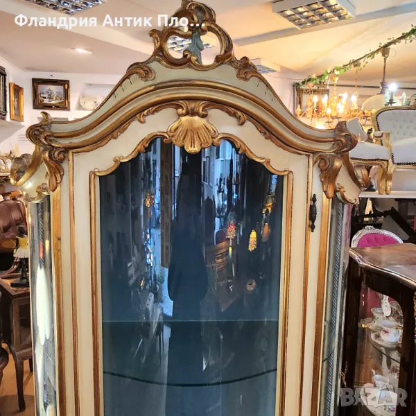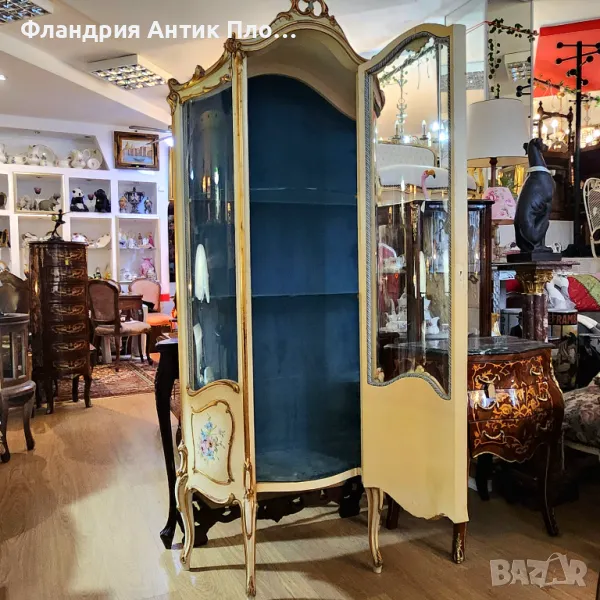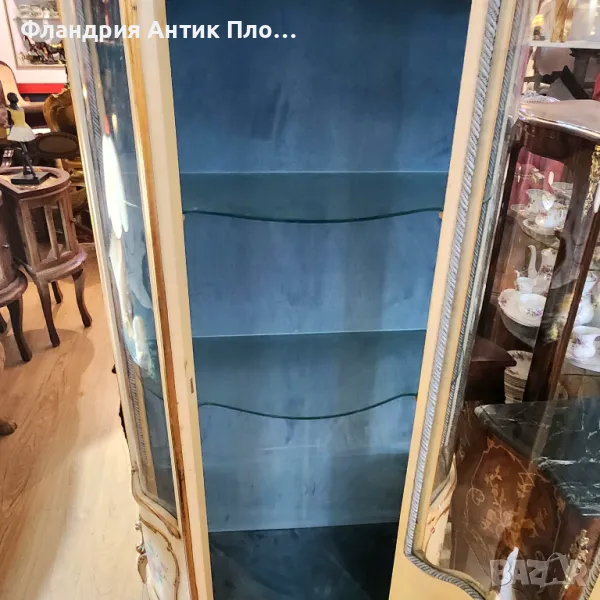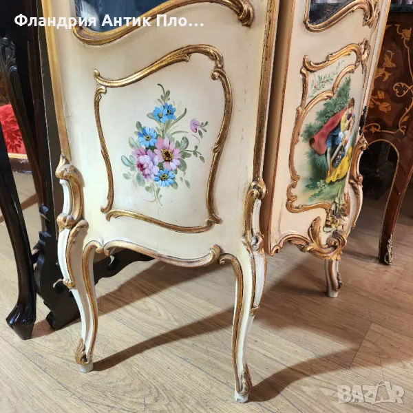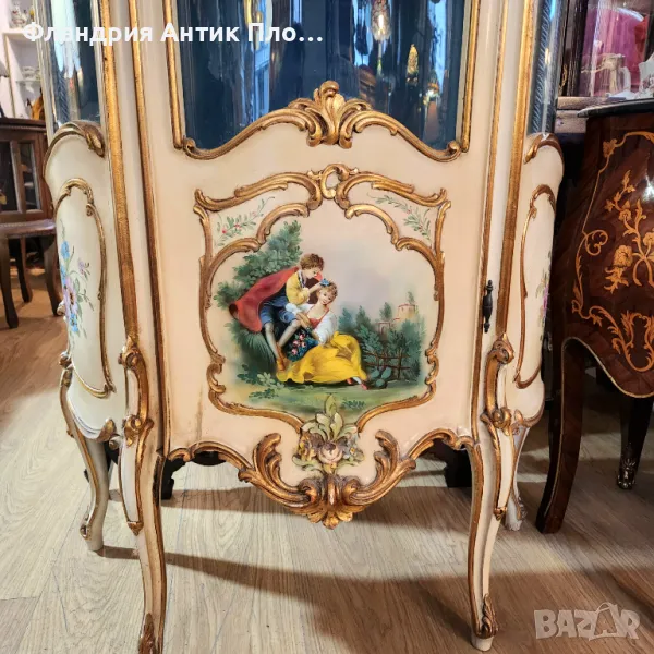 Тази изискана витрина впечатлява с елегантния си дизайн и класически детайли. Ръчно рисуваните панели в пастелни цветове, изобразяващи романтични сцени, придават на витрината уникално излъчване. Стъклените врати и рафтове позволяват изящно излагане на порцеланови сервизи, колекции или декоративни предмети. Завършена със златисти орнаменти и меки извивки, тя е перфектният акцент за интериор с класическо или винтидж излъчване.