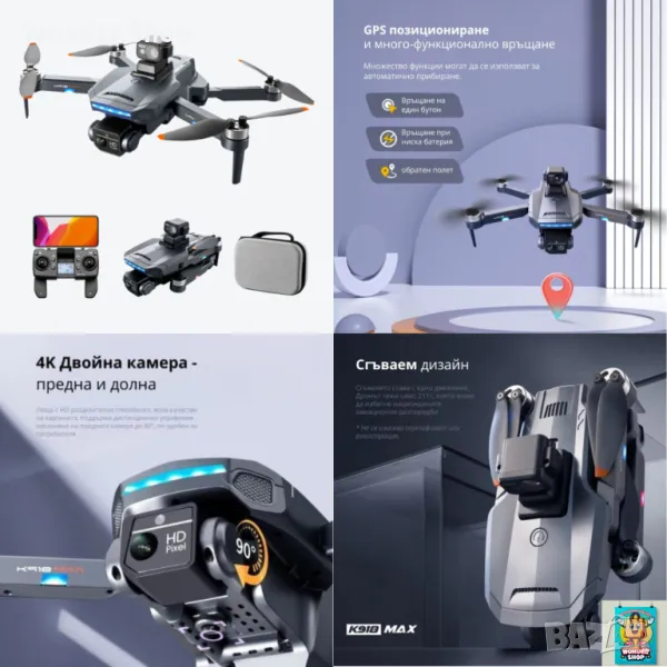 Професионален сгъваем дрон K918 MAX, 4К двойна камера - За впечатляващи въздушни кадри и максимална гъвкавост!