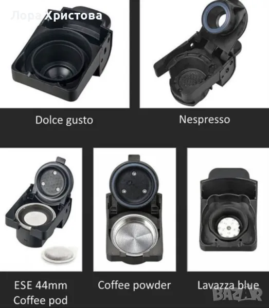 5 различни адаптера за кафе: Долче густо (Dolce gusto), Неспресо (Nespresso), Лаваца блу, Мляно кафе, ESE 44 мм. Coffee pod;