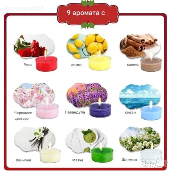 Комплектът съдържа 24 свещи с 9 магически вариации на аромати и 1 поставка за чаени свещи от прозрачно стъкло.