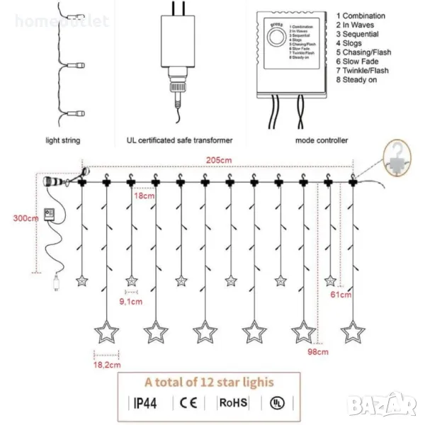 Светлинната верига се предлага с 8 режима, за да създаде уникална атмосфера.