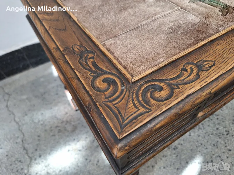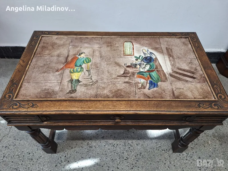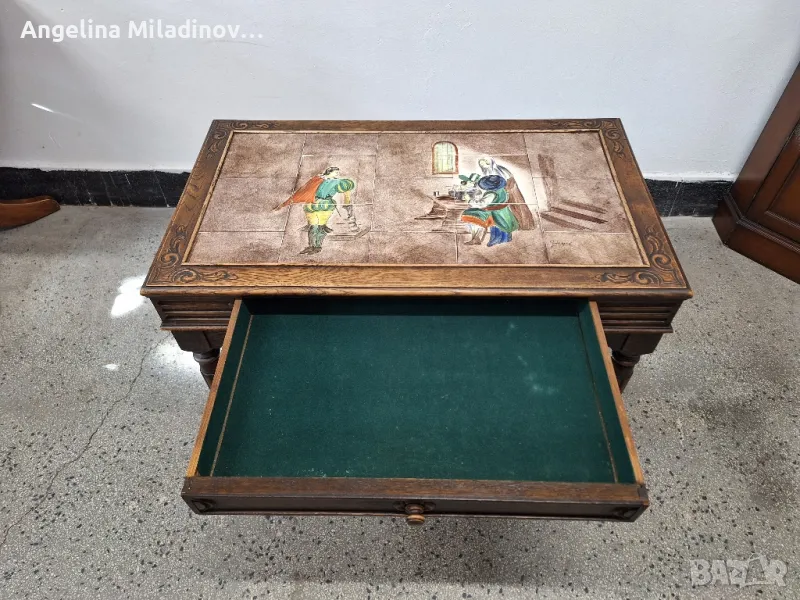 УНИКАТ! Маса за всекидневна с богата дърворезба и плочки. Невероятна датска изработка - богата дърворезба, масивни крака и красива картина от порцеланови плочки. Практично чекмедже подплатено със зелено сукно завършва лукса на масата. Ще сте неповторими с тази УНИКАЛНА маса. Разгледайте и другите ми обяви. Последвайте ни и във фейсбук Мебели шик. Предлагаме и изгоден транспорт за цялата страна. Размери:Дължина - 88 см.Ширина - 50 см.Височина - 57 см.Цена - 200 €. 391,17 лв.