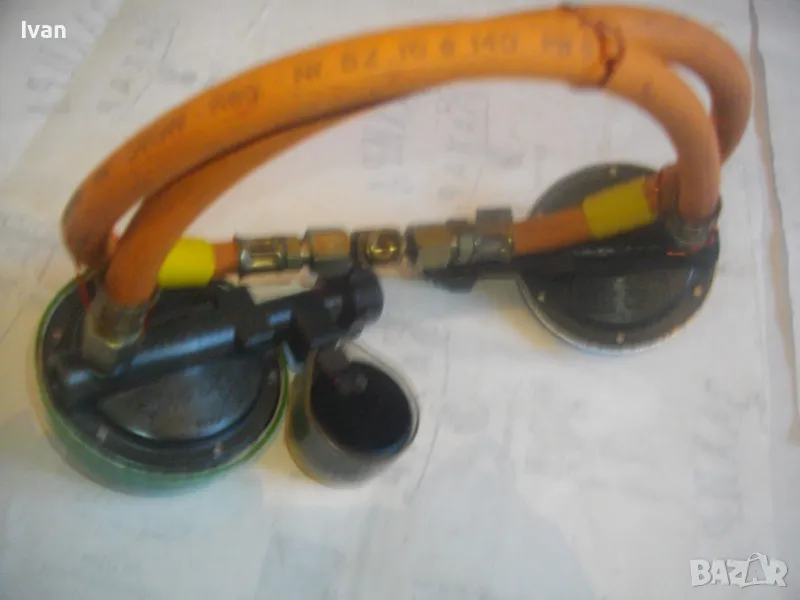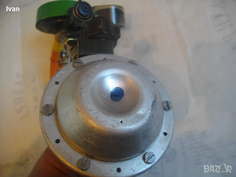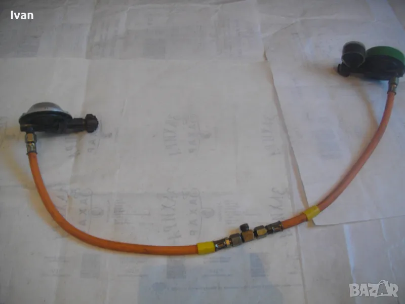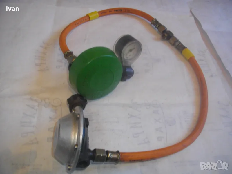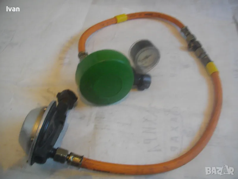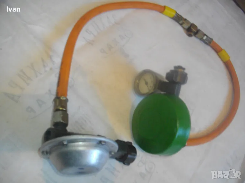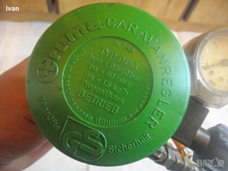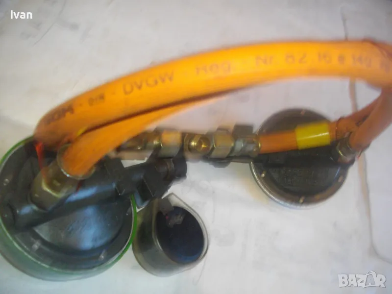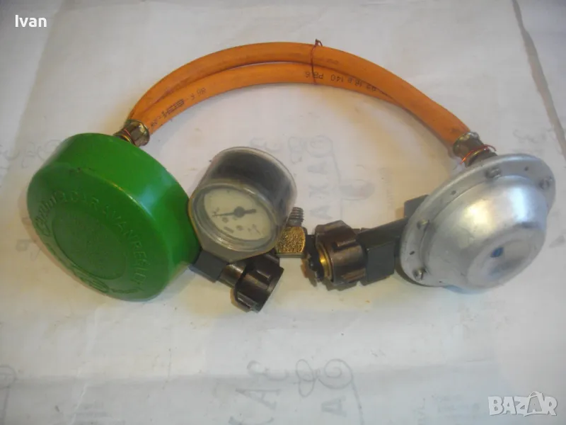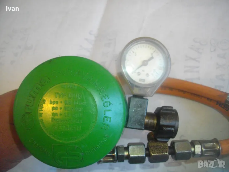Скачен манометър към клапана оригинален на WIKA 0-16 bar, със защитно тяло. Скачен маркуч 40 см, към клапана вентил, който с тройник внадка разклонителна е скачен за друг маркуч също 40 см, който завършва редуцир вентил немски оригинален старо масивно качество алуминиев голям ф90 мм. Втория алуминиев вентил също е марка TRUMA на производител GOK.