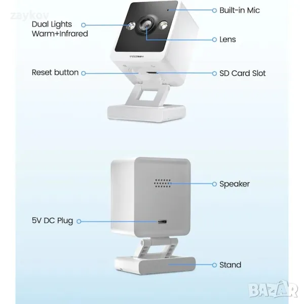【Двупосочно аудио】 - Камерата VEEZOOM има вграден микрофон и високоговорител, така че можете да виждате, чувате и говорите с всеки, който минава пред камерата, дори да давате команди на вашия домашен любимец. Тази вътрешна камера работи само с 2.4 GHz Wi-Fi (5G не се поддържа)