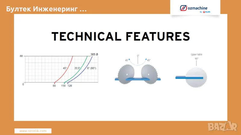 Преносим циркуляр (пендула) Озчелик Алфа за рязане на PVC и алуминиеви профили. Чисто нов с гаранция. Възможност за рязане от -45 до +45 градуса. Максимален размер на диска 305мм. Цената е с включено ДДС. Без диск. Заедно с диск (немски) 300мм - 627.20€ с ДДС.