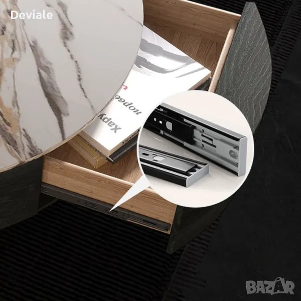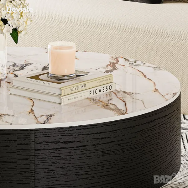 Модерна масичка за кафе с дъбов фурнир и плот от синтерован камък и място за съхранение