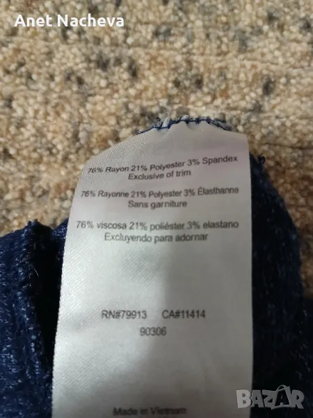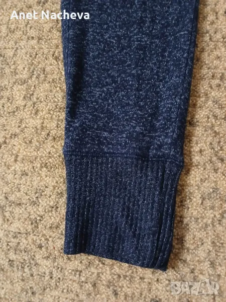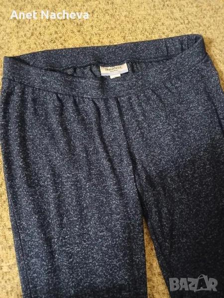 Дължина - 92см, талия - 94см с разпъната широка ластика, ханш - 116см, тъмносин меланж, крачола завършва с плетено парче, 86% вискоза