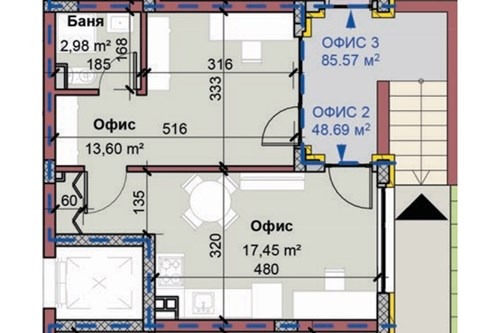 Жилището е със статут на офис, разположено на партерен етаж, с чиста площ 40,66 кв.м., разпределени в: