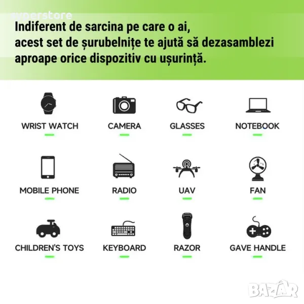 В комплекта се включват 8 отвертки със специфични върхове с вътрящ се връх на дръжката, за лесно отваряне на телефони и друга техника.